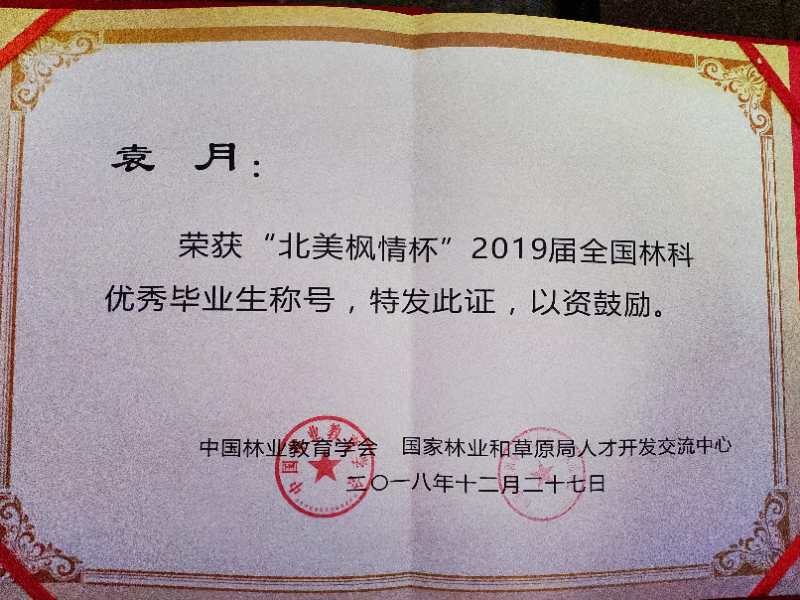 袁月同学全国林科优秀毕业生获奖证书