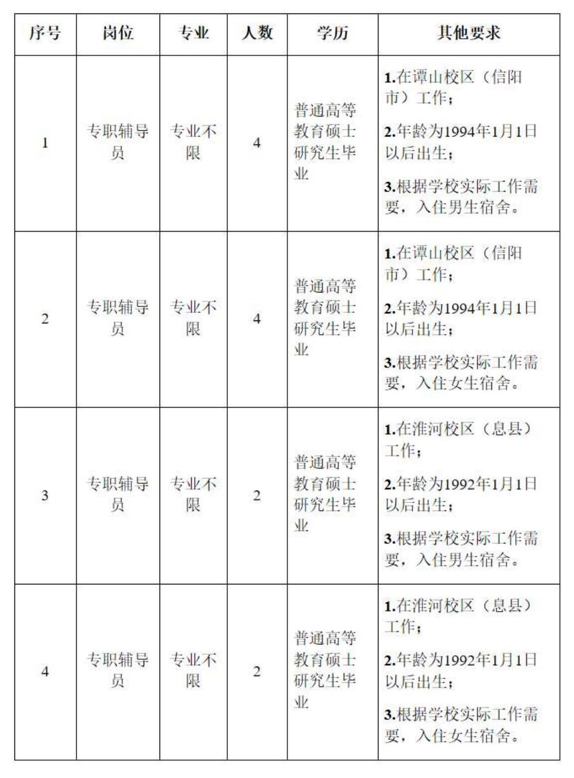 6.具体条件详见附件《信阳师范公司2022年公开招聘员额制专职辅导员一览表》;
