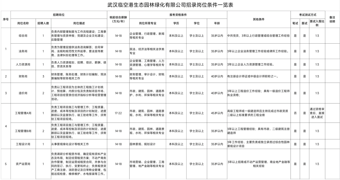 招聘岗位所需的具体条件按附件《武汉临空港生态园林绿化有限公司招录岗位条件一览表》要求确定。应聘人员应认真阅读所应聘单位的《招聘公告》,了解所应聘单位的具体要求和工作安排。