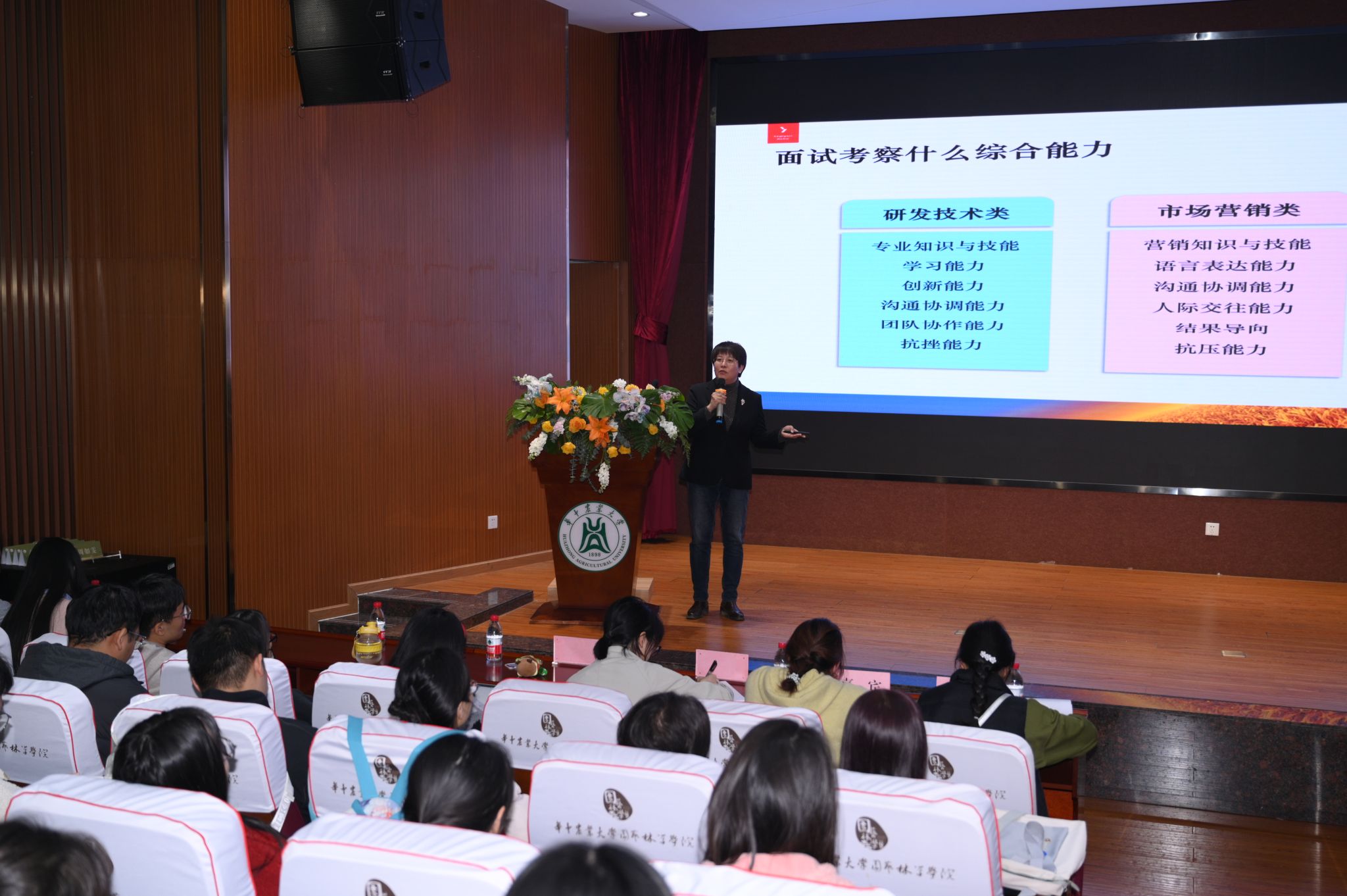 李飒老师还通过实际案例分析,生动地向同学们说明,在面试过程中需如何体现自己具备解决问题、分析问题、克服问题的能力。细致地区分了不同岗位类别(如研发技术、市场营销、管理培训生)对综合能力要求的异同。她讲到,虽然沟通协调能力、学习能力和团队合作精神是各岗位通用的“硬通货”,但特定岗位如研发需抗挫与创新思维,营销则侧重更强的抗压能力与人际交往能力,管理培训生则需展现出色的领导力与决策能力。