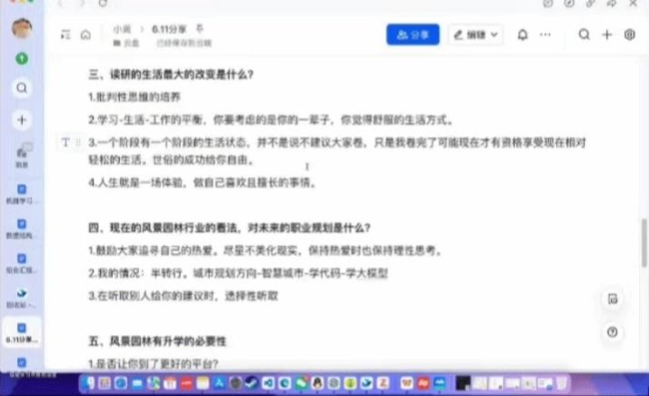 最后一位分享嘉宾是保研至北京大学风景园林专业的黄懿学姐。黄懿学姐以极为松弛的状态详细介绍了保研的准备历程及其研究生阶段的学习与生活体验,并着重分享了读研期间的个人成长与转变。谈及未来规划,学姐阐述了自己的职业发展构想,并强调在规划过程中保持专业热忱与理性思考至关重要,同时建议审慎甄别并采纳各方意见。对于风景园林专业而言,她指出,如果热爱本专业,建议继续深造。此外针对收集表中各个年级同学们提出的问题,黄懿学姐均给出了详细解答。在分享尾声,黄懿学姐总结道,成长具有鲜明的阶段性特征,人生是一场盛大的体验之旅。