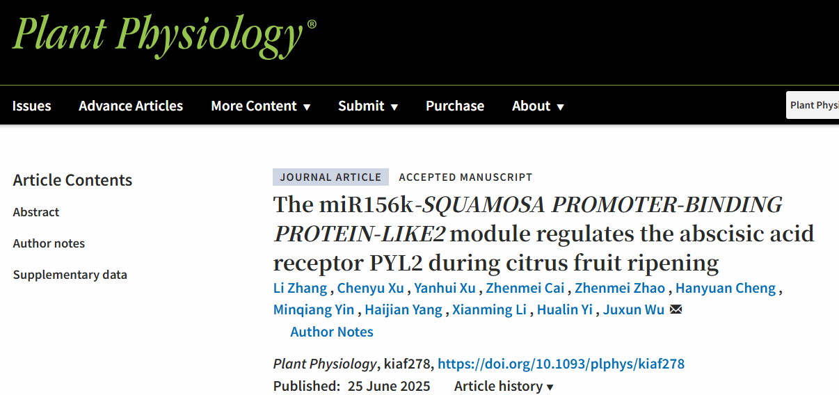近日,bv伟德国际1946果蔬园艺作物种质创新与利用全国重点实验室伊华林/吴巨勋课题组在Plant Physiology发表了 “The miR156k-SQUAMOSA PROMOTER-BINDING PROTEIN-LIKE2 module regulates the abscisic acid receptor PYL2 during citrus fruit ripening”的研究论文,揭示了csi-miR156k通过靶向SPL2促进柑橘果实成熟的功能和分子机制。