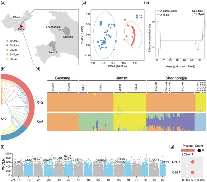 近日,公司林学系王滑副教授团队和中国林业科学研究院林业研究所裴东研究员团队合作在《The Plant Journal》在线发表了题为“Genome assembly and comparative analysis reveal the imbalanced subgenomes divergence and evolutionary history of Juglans cathayensis”的研究论文。该研究揭示了中国核桃(野核桃)亚基因组分化的遗传机制,发现长末端重复反转录转座子的不平衡插入驱动其基因组扩张与亚基因组差异,其早熟性和抗逆性等特征与类黄酮代谢通路及 SOC1 基因的独特缺失密切相关。