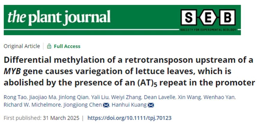 2025年3月31日,bv伟德国际1946果蔬园艺作物种质创新与利用全国重点实验室和湖北省洪山实验室匡汉晖教授团队在《the plant journal》发表了题为“Differential methylation of a retrotransposon upstream of a MYB gene causes variegation of lettuce leaves, which is abolished by the presence of an (AT)5 repeat in the promoter”的研究论文。该研究揭示了生菜MYB转录因子启动子区域的DNA甲基化差异导致叶片红色斑点形成的分子机制,并发现启动子区域存在特定长度的简单重复序列时,叶片会呈现均匀的红色表型。