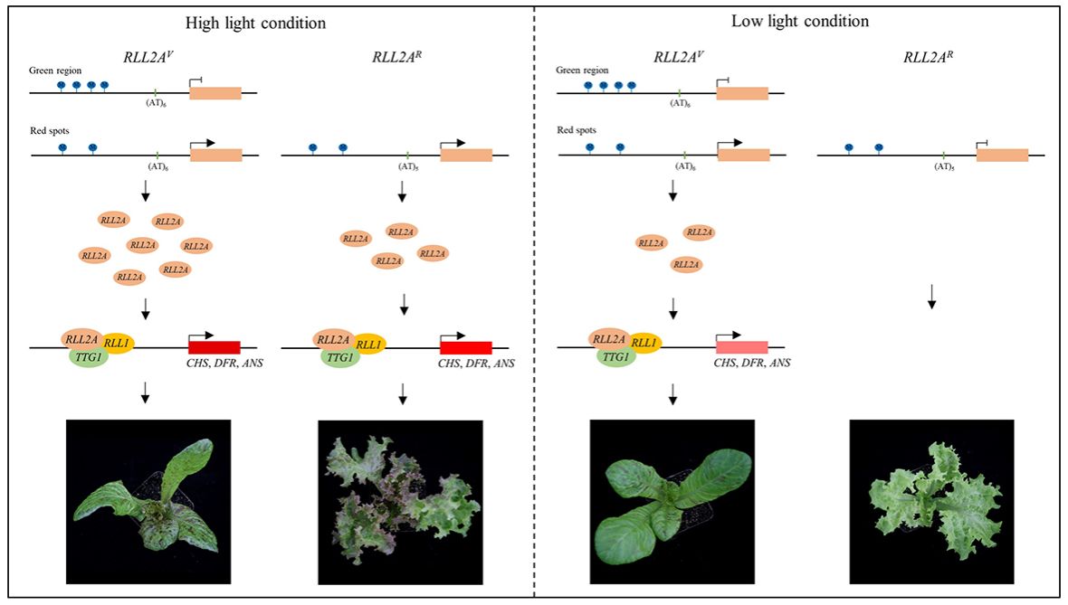 研究团队通过构建双亲分离群体,并结合Bulked Segregant Analysis(BSA)和RNA-seq(BSR-Seq)技术,成功鉴定了调控生菜叶片红色斑点表型的位点。研究发现,两个位点调控生菜红色斑点的有无表型。针对这两个位点,研究团队分别构建了分离群体,并通过精细定位和基因克隆,确定了两个关键基因:LsANS和编码MYB转录因子的RLL2AV。其中,LsANS基因的功能缺失会导致花青素合成途径受阻,从而引起红色斑点消失,但该基因并不直接参与斑点形成的调控。而转录组分析结果显示RLL2AV基因在红色斑点区域特异性表达,在绿色区域不表达。这种表达模式与RLL2AV基因-761 bp位置插入的反转录转座子的甲基化水平密切相关:在红色斑点区域该反转录转座子的甲基化水平较低,而绿色区域则表现出较高的甲基化水平。进一步遗传分析表明,当RLL2A启动子-409 bp处存在(AT)5重复序列时,RLL2A基因稳定表达,从而使叶片呈现均匀的红色表型。本研究发现了生菜中通过MYB基因启动子区域甲基化水平差异调控红色斑点形成的分子机制,同时证明了特定长度的简单重复序列对基因表达的稳定性具有重要调控作用。