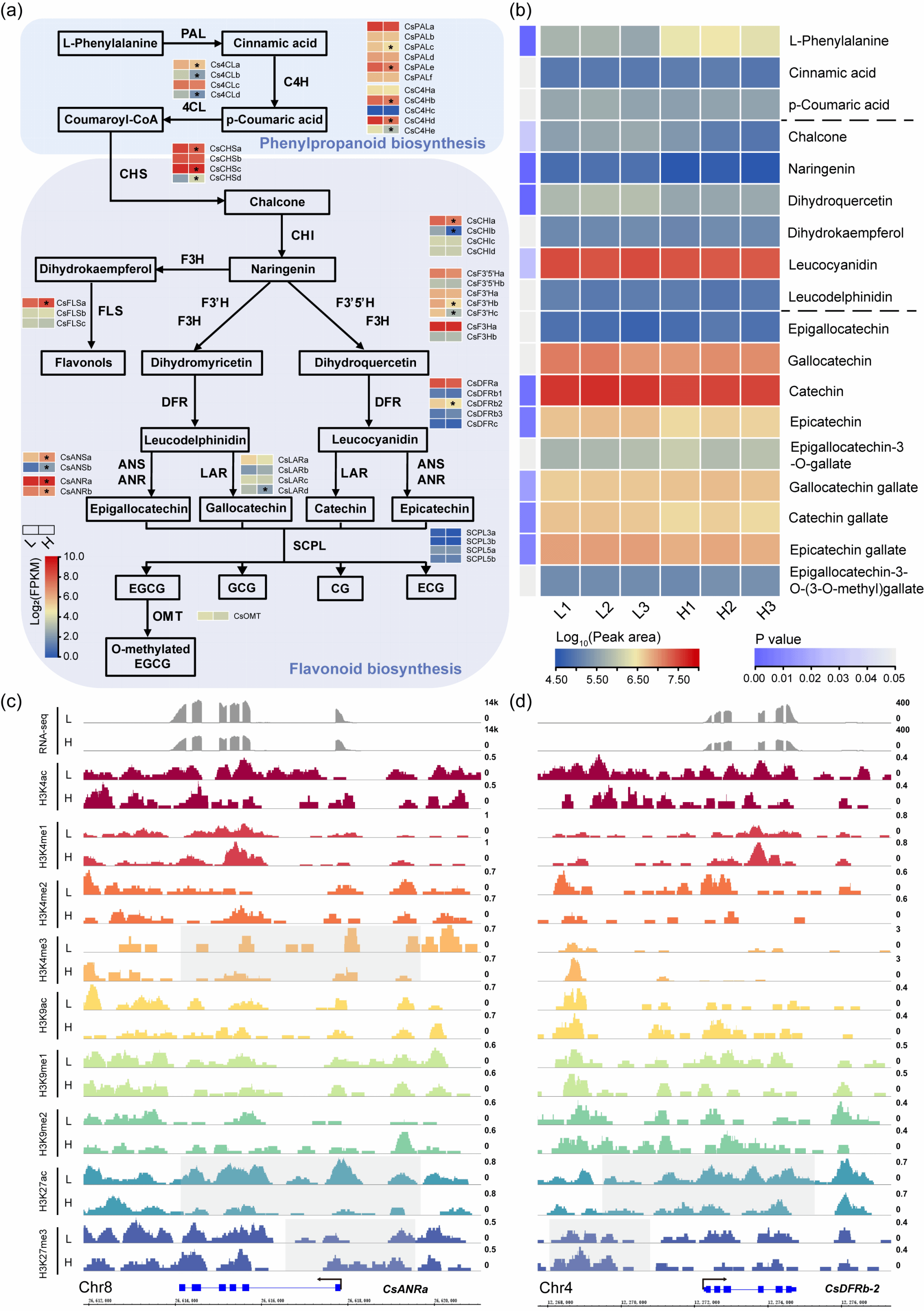 研究团队进一步绘制了9种关键组蛋白修饰的基因组分布图谱,发现其与基因表达之间存在复杂关系。多组学分析表明,组蛋白修饰(H3K4ac、H3K4me3、H3K9ac、H3K9me2、H3K27ac和H3K27me3等)在基因区域的动态变化与气孔发育调控基因及次级代谢途径中酶基因的表达密切相关,导致高光条件下气孔密度和代谢物(类黄酮、茶氨酸、咖啡碱和色素)的变化。其中,H3K27ac和H3K27me3被鉴定为关键组蛋白修饰,调控了包括CsEPFL9、CsYODAb、CsF3’Hb、CsCHSc等在内的多个关键基因的表达。该研究为解析茶树在强光条件下的叶片发育及次级代谢调控的表观遗传机制提供了新视角,也为茶树栽培和品质改良提供了重要的理论依据。