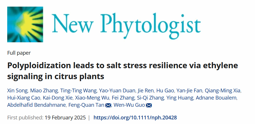 近日,公司伟德bv1946官网、果蔬园艺作物种质创新与利用全国重点实验室、湖北洪山实验室郭文武教授团队在《New Phytologist》期刊发表了题为“Polyploidization Leads to Salt Stress Resilience via Ethylene Signaling in Citrus Plants”的研究论文。该研究以遗传背景相同但倍性不同的枳、红橘和香橙等柑橘砧木为材料,揭示了染色体倍性变化对根系发育及盐胁迫应答的影响。研究发现,基因组加倍通过染色质重塑增强乙烯信号途径,显著提高了柑橘砧木盐胁迫抗性,为应对盐碱地挑战提供了新思路。