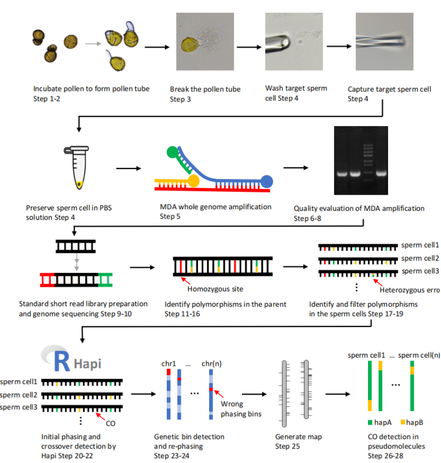 单倍型信息在基因组学和遗传研究中起到了至关重要的作用,比如在填补缺失基因型数据、研究重组交换模式以及追溯物种演化历史等方面的应用,其对单体型基因组的组装也具有重要价值。然而,对于复杂基因组的单倍型分型仍是一个亟待解决的重大挑战。为攻克这一难题,该研究团队以茶树为实验材料,利用配子体这一天然的单倍体,基于单细胞测序技术,开发了一套全面且系统的流程。该流程由28个步骤构成,包括显微操作以及基因组扩增和测序等“湿实验”和生物信息学分析,涵盖了植物单精子的分离、单倍型分型以及重组交换位点的检测(图1)。这套方案能够精确地识别单精子间单核苷酸多态性(SNP),并基于此构建高密度的遗传图谱,从而可助于实现精准的染色体级别分型,有效地检测重组事件,并可应用于纠正潜在的基因组组装错误。生物信息分析流程可在Linux系统上高效运行,通过Docker镜像的方式,极大地简化了分析流程,降低了操作难度。这一创新不仅提升了分析效率,使得整个工作流程在一天内即可完成,而且展现了其在基因组学等研究中的巨大潜力和应用价值,为研究人员提供了更为便捷、高效的工具,助力其在基因组学等生物学研究领域取得更为深入的突破。