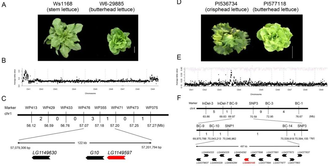 莴苣是一类重要的蔬菜作物。从园艺学角度,莴苣主要包括结球生菜、奶油生菜、罗马生菜、散叶生菜、莴笋和油麦菜。莴苣的株型在生产上是非常重要的性状。以结球生菜为例,结球株型特征可以降低运输过程引起的损耗、大幅延长货架期等优势。近年来,通过正向遗传学方法,鉴定到调控生菜结球性的关键基因LsKN1和LsSAW1。奶油生菜株型别致,具有较高的园艺观赏价值。这种生菜也具有类似叶球的株型紧凑特征,然而这种株型遗传及分子调控基础鲜有报道。