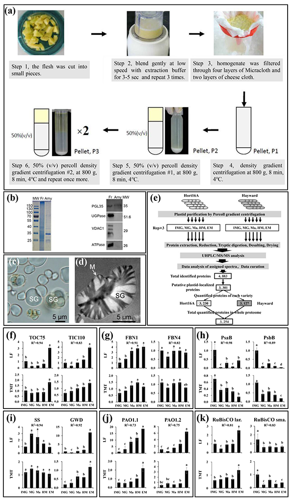 我们创造性地发明了一种基于密度梯度离心方法的猕猴桃果肉淀粉体的分离提纯方法,并将之成功的应用到黄/绿肉的不同发育与成熟期质体的分离提纯。基于此,我们首先利用Label-free和TMT技术,解析并构建了目前为止最大的淀粉体蛋白谱库(图2)。其次,比较蛋白组学分析表明GWD、PWD及BAM等多个参与淀粉代谢的关键蛋白,可能参与淀粉颗粒的降解;TOC/TIC以及ATPase蛋白可能参与淀粉体生物形成与分化。更为重要的是,我们发现光合作用和四吡咯途径相关蛋白在两种果实淀粉体分化过程中的变化模式存在显著差异,推测二者可能是影响淀粉体分化的关键蛋白。