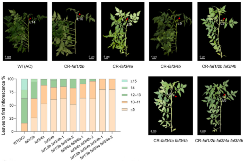研究人员通过表达分析发现SlFAF家族的5个基因中,SlFAF1/2a表达模式与SAM(shoot apical meristems)发育时期高度相关,超量表达SlFAF1/2a,相对于WT其始花节位缩短了2-5个节位,开花时间提前了20天左右。