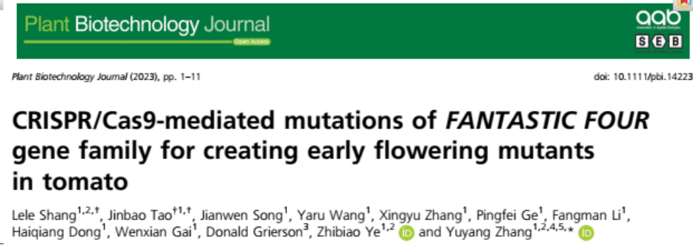 近日,bv伟德国际1946园艺作物种质创新与利用全国重点实验室番茄课题组在Plant Biotechnology Journal发表了题为“CRISPR/Cas9-mediated mutations of FANTASTIC FOUR gene family for creating early flowering mutants in tomato”的研究论文。