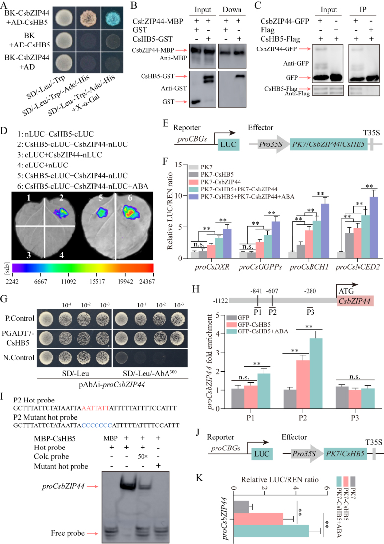 图2 CsHB5与CsbZIP44互作并作用于CsbZIP44上游直接激活CsbZIP44表达