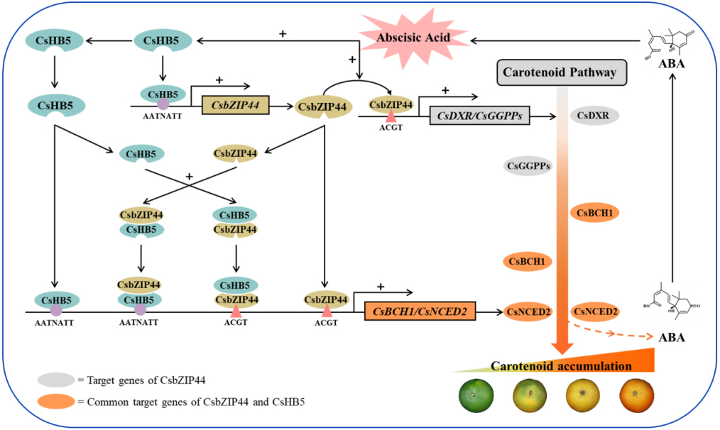 图3 CsbZIP44-CsHB5模块调控ABA诱导的柑橘类胡萝卜素合成的模型图