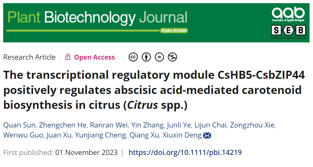 近日,伟德bv1946官网/果蔬园艺作物种质创新与利用全国重点实验室邓秀新院士团队在Plant Biotechnology Journal在线发表了题为“The transcriptional regulatory module CsHB5-CsbZIP44 positively regulates abscisic acid-mediated carotenoid biosynthesis in citrus (Citrusspp.)”的研究论文。该研究解析了ABA信号调控柑橘果实类胡萝卜素生物合成的分子调控机制,为柑橘果实色泽品质遗传改良及通过采前栽培和采后生产措施提升果实外观品质提供了重要依据。