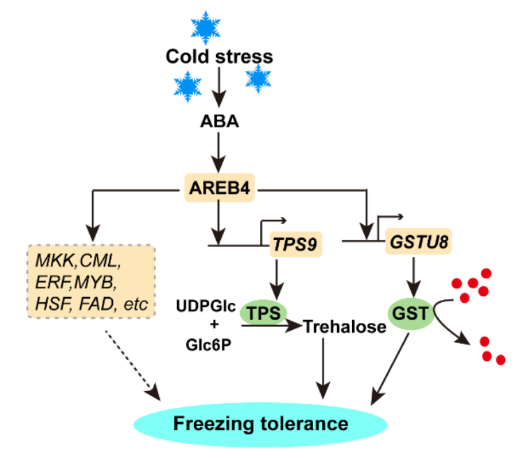图2. 冷胁迫下AREB4 调节冷冻抗性的推测模型