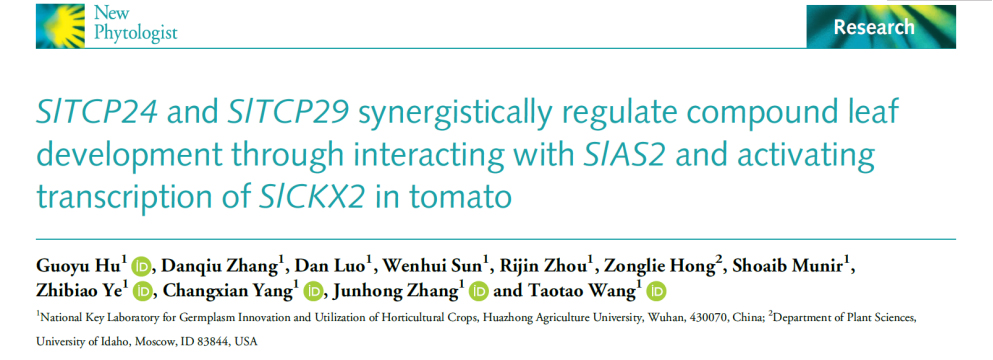 近日,bv伟德国际1946番茄团队王涛涛、张俊红教授课题组在国际权威学术期刊《New Phytologist》发表了题为《SlTCP24andSlTCP29synergistically regulate compound leaf development through interacting withSlAS2and activating transcription ofSlCKX2in tomato》的研究论文。TCP转录因子在调控植物的叶片发育过程中起着重要作用,研究发现SlTCP24和SlTCP29共同调控番茄复叶发育,是番茄复叶发育的负调控因子,当两个基因同时被敲除时,叶片的小叶数显著增加,叶型更加复杂。