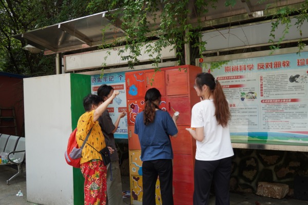 在西社区党员群众服务中心旁边,由校图书馆捐赠的共享书柜荒废已久。在完成测绘工作后,实践团决定运用专业知识为书柜设计图案,让共享书柜重新发挥作用,推进西社区人文建设发展。
