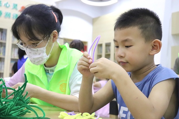 课堂配套活动——扭扭花制作也深受小朋友们的喜爱。在莫丹妮及其他团队成员的指导下,小朋友们循序渐进地学会了花蕊、花瓣、花叶等各部分的基本制作技巧,再用胶带将各部分组合,一朵朵造型精美的扭扭花便大功告成。接着小朋友们发挥奇思妙想,举一反三,利用扭扭花材料制作出了手环、戒指、发饰等各类创意作品。