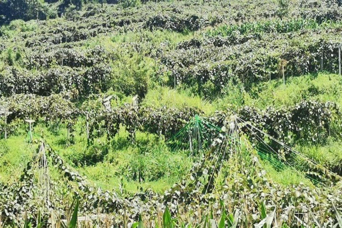 在猕猴桃的田间管理中,剪枝也是非常重要且困难的一个项目。村民需要经过专业技术人员的培训和丰富的经验积累才能在果园游刃有余。恰巧在实践开展时属于夏季修建时期,团队成员跟随当地优秀的种植户学习了夏剪技术。在学习夏剪时,农科院的刘特老师还给团队成员们讲解了新果园里的项目:伞形架,即在五个T形架在铁丝和线的拉扯下塑形成一个伞形可将枝条牵引其上,而牵引在上面的是来年的结果母枝。这样做的优势在于更加高效地利用了空间和阳光,无形之中给冬季修剪等田间管理带去了便利。