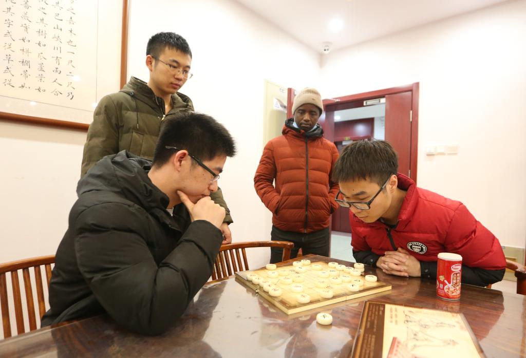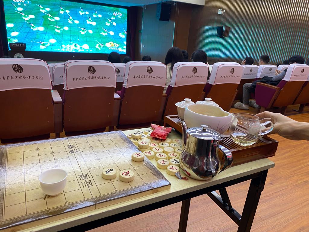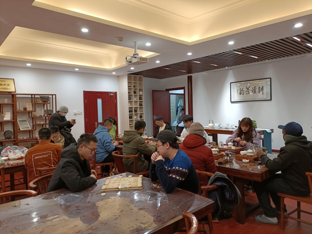 品茗的同时,茶室也组上了其他的“局”。象棋爱好者们打起了擂台,互相挑战,围观者们也在一旁献智献策,生怕遗漏一步好棋。另一桌上的同学们也组队玩起了桌游,不管之前是否相识,通过游戏的交流同学们很快便熟悉了。