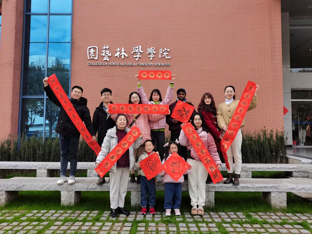 上联:狮山嘉木抽芽吐绿绿意浓浓喜迎新春,下联: 茶学师生张灯结彩其乐融融欢度佳节,横批: 茗香园林(20级茶学研究生赵潇懿)。