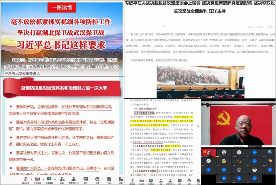 张斌带领支部党员集体学习了习近平总书记《毫不放松抓紧抓实抓细各项防控工作坚决打赢湖北保卫战武汉保卫战》和《坚决克服新冠肺炎疫情影响坚决夺取脱贫攻坚战全面胜利》的重要讲话。结合公司2020年工作要点,对党员同志在近期院系工作中的表现和带头作用进行了简要剖析,提出党员教师要认真领会贯彻习总书记讲话精神,充分发挥先锋模范作用,在教学科研工作中锐意改革,在乡村振兴、脱贫攻坚等国家经济社会重大亟需方面集结发力。