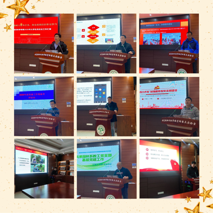 茶学系教工党支部从理论学习、校地共建助力企业重振以及决战脱贫攻坚三个维度总结了2020年的党建工作;风景园林系教工党支部则立足基层党建工作,深入阐明了支部战斗堡垒作用的发挥情况及支部书记履职尽责情况;果树系教工党支部创新型“党支部+”建设模式,让支部党员形成群体效应,为支持产业、扶持产业提供组织保障;行政教工党支部以“‘四力齐发’加强服务型党支部建设”为主题,汇报了服务型党支部建设的情况;蔬菜系教工党支部及重点实验室党支部展示了支部成员火线战疫、坚守岗位、下沉社区、靠前服务的事迹,真正在防控疫情斗争中经受考验,做到守土有责、守土尽责;园林系教工党支部以加强组织建设为切入点,重点阐述援藏教师感人事迹,突出展现党员先锋模范作用;老员工党总支汇报了一年以来在员工思想引领建设方面的工作成效。