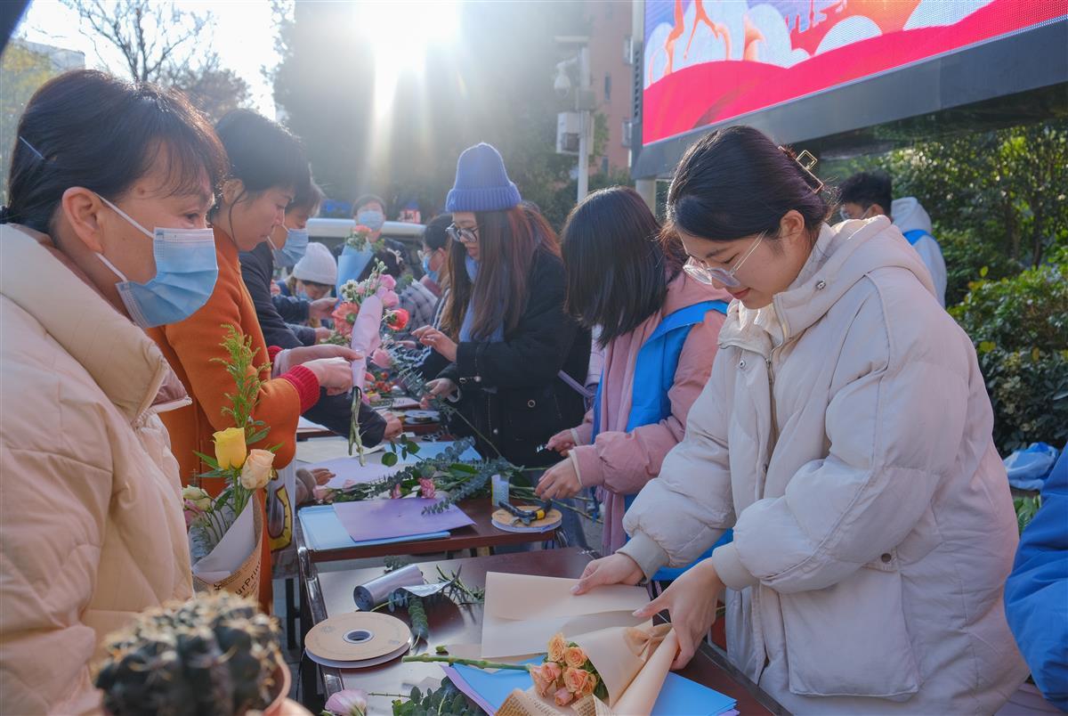 居民们挑选出自己喜欢的花卉品种,在员工志愿者的指导下,用剪刀进行修剪、去除花柄上的尖刺,并用丝带缠绕包装纸,一束精美的手捧花便制作成功。百余名居民先后进行了体验。