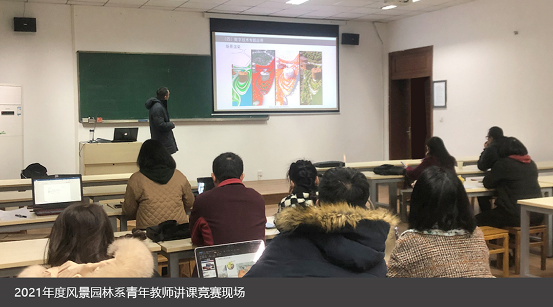 9位青年教师分别选择各自主讲课程中的部分章节,通过说课、讲课2个部分阐述了所讲课程的教学定位、目标、教学设计、重难点,并对核心章节进行讲授。课程涉及风景园林、园林2个专业的规划、设计多种类型。