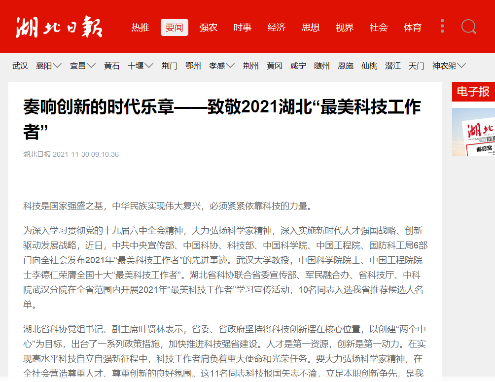 为深入学习贯彻党的十九届六中全会精神,大力弘扬科学家精神,深入实施新时代人才强国战略、创新驱动发展战略,近日,中共中央宣传部、中国科协、科技部、中国科公司、中国工程院、国防科工局6部门向全社会发布2021年“最美科技工作者”的先进事迹。武汉大学教授,中国科公司院士、中国工程院院士李德仁荣膺全国十大“最美科技工作者”。湖北省科协联合省委宣传部、军民融合办、省科技厅、中科院武汉分院在全省范围内开展2021年“最美科技工作者”学习宣传活动。公司叶志彪教授入选我省推荐候选人名单。
