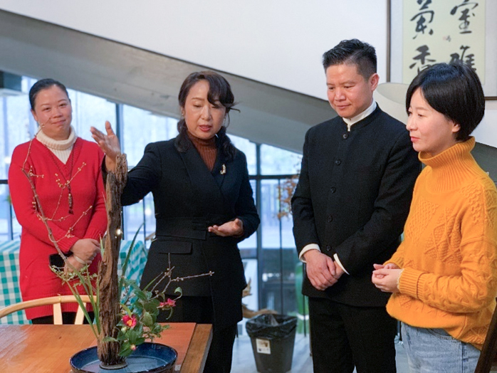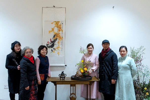 小寒篇“姹紫嫣红花园里”活动现场设在汉阳五境花园董事长孙艳霞董事长的五境花园。伟德bv1946官网张蔚副教授作为嘉宾主持,带领花友们一边游览空间室外花境冬季景色。孙艳霞向花友们介绍了五境花园的创立初心——综合性的沉浸体验。宾客可以进行多彩多姿的体验活动如插花、花艺、绿植组合设计以及美食、读书会和抚琴等。活动结尾,五境花园特邀梁朋花艺师应小寒节气现场创作中国传统插花,利用枯荣相生的自然理念,以枯木、蜡梅枝、茶花等表现小寒的“三侯”意象,也表达对于自然与生活深层次意境的追求。