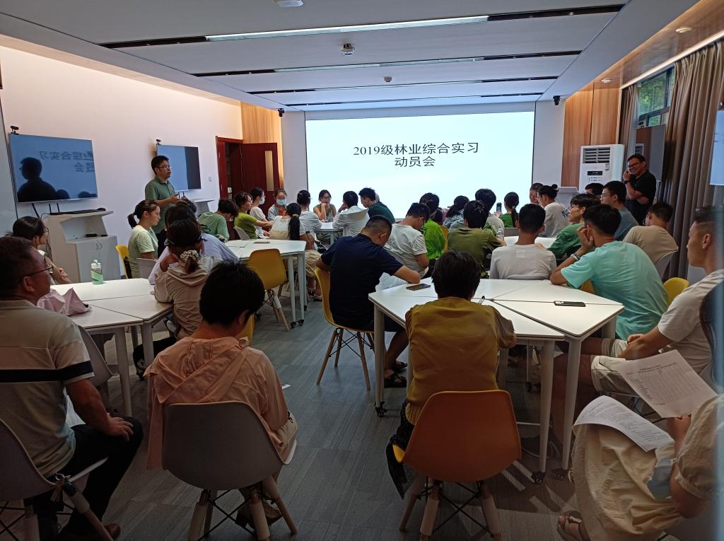 在实习出发前,林学系于8月13日下午召开了综合实习动员会,公司党委副书记蔡江、副经理周继荣出席会议。此次综合实习,主要围绕林业产业特点、林分生长、立地质量评估与建模、抚育采伐设计、造林规划设计、苗圃规划设计和种子园规划设计等方面开展教学实习。