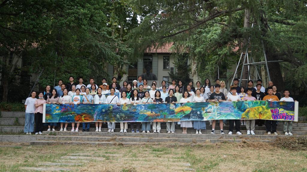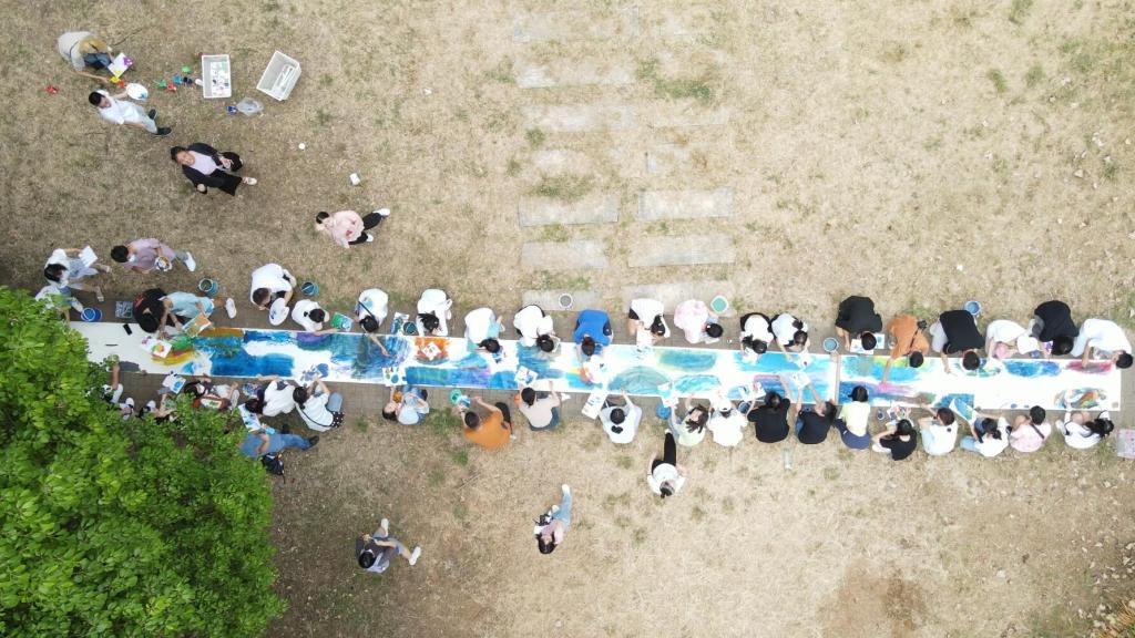 “景园心涂”,即景园新生的首次涂鸦体验活动,在黄滟老师和洪勇辉老师的带领下同步开展。黄滟老师为新生们讲述了涂鸦的主题和详细步骤;洪勇辉老师带领新生们了解了绘画材料和涂鸦技巧,为大家打开了绘画思路,并强调要以放松的状态享受景园人的第一笔美好。62名新生积极参与涂鸦,选画材、铺色、调颜料……有条不紊,井然有序。白色长卷在大家水彩笔的渲染下,染上湖蓝、靛紫、金黄等多彩颜色,描绘出瞬间的灵感,最终形成一幅“梦幻星空”水彩图。“Hello,你好,景园!”涂鸦期间,大家纷纷向天空中的无人机摄像挥手,留下幸福一刻。