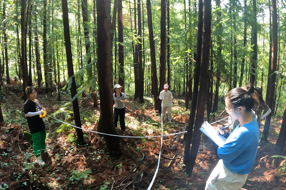 森林资源的调查作为实习外业的重点,是实地了解森林资源的现状的最直观途径。通过提前踏查,同学们在松柏林场和红花朵林场分别选择了杉木人工纯林、栎类纯林及针阔混交林等不同起源的林分开展样地每木检尺的调查,测量胸径、树高、冠幅、年龄等基本指标,对林下灌草植被、土壤、小气候等生态因子做相应的纪录分析。同时,结合卫星影像和现实状况分析年初雪灾及对应抚育间伐前后对林地的影响。