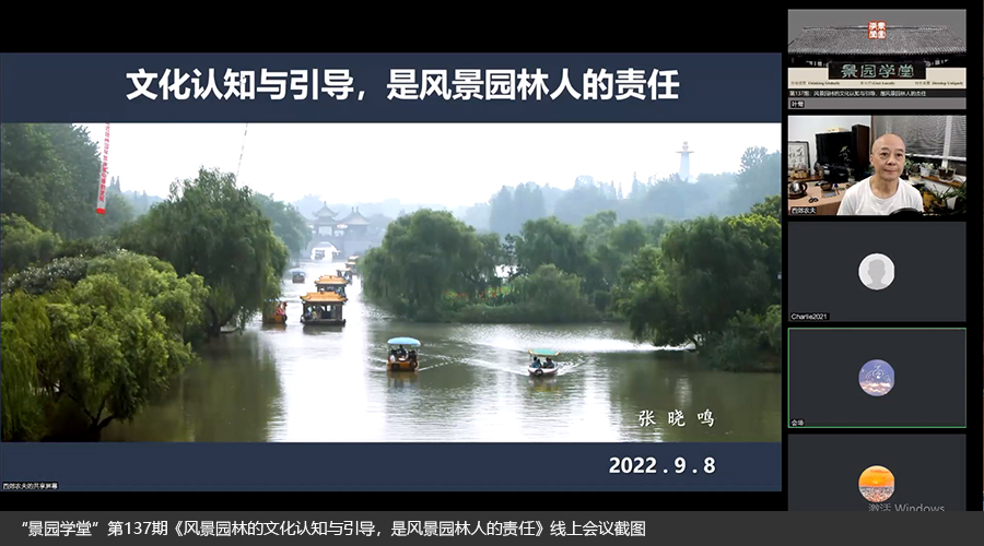 “风景园林是人们追求美好生活的理想空间。”张晓鸣指出,从风景园林、风景名胜区的定义来看,风景被赋予了文化内涵和情感寄托,承载了人们追求精神的理想境界。在现场,他选择了几张异域风景照来论证这个观点:泰山展现了天地辽阔,宣示皇家权威,体现了“一览众山小”的豪情;黄山中群山对峙,仙气飘飘、道骨仙风之感充溢;太湖,平山远水,烟波浩渺……张晓鸣以高清摄影带给人一种视觉冲击,让在云端的师生“沉浸式”地享受美景。