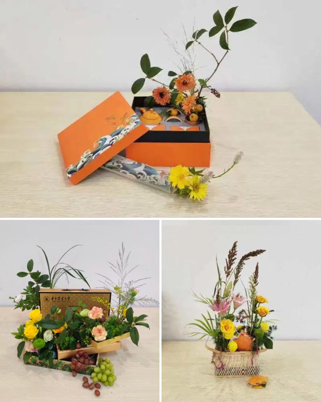 王彩云老师与员工们共同创作的《橙里月光》、《春华秋实》与《菊黄蟹肥》,巧妙地利用了公司的月饼礼盒、茶具礼盒等日常包装礼盒插花。其中《橙里月光》以礼盒的橘色为基调,配以橙黄色系的非洲菊、金鸡菊,展现金秋硕果累累、温暖祥和的气氛。《春华秋实》中以园林系老师研究的月季、康乃馨、桂花、兰花和观赏草为背景枝、花材和叶材,将美味葡萄串点缀其中,花朵和果实交相搭配,勾勒出春花秋实的美好图景。《菊黄蟹肥》中运用成熟度不同、色彩渐变的高粱穗、旱伞草和黄色乒乓菊、月季、橙黄色的螃蟹壳与编织篮,表现武汉大江大湖秋吃螃蟹赏菊的美景,流露出浓浓的农家丰收季喜悦与期盼。