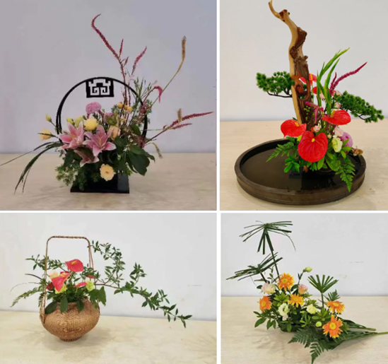 为献上中秋节和教师节祝福,王彩云老师和老师同学们还现场创作了《花好月圆》。借由圆形框景,搭配象征美满阖和的百合花作为主花材,加以秋季特色花材鸡冠花,饱满的轮廓与花材明亮和谐的色彩传递出花好月圆人长久的祝福。在此中秋佳节之际,祝福每个家庭健康、团圆、美满。《松鹤延年》以象征长寿的崖柏老人雕刻为主干,配仙鹤起舞的象形唐菖蒲花枝和松枝、红掌等祝愿老人们健康长寿。《全心育人》以红掌、栀子表达教育者兢兢业业、辛勤育人的一片赤诚之心,并以此作品向各位老师致以崇高的敬意。研究生新生邓楠同学创作的《烟雨行舟》运用娴熟的编织技法将散尾葵编织成一尾小舟作为异形容器,修剪的旱伞草象征南方传统的防雨保暖蓑衣,用亮丽的橙色非洲菊为焦点花,栩栩如生地表达员工不忘初心,砥砺前行的信念,其新颖的构思和技法收获了参观者的一致好评。周欣老师和邓楠、刘星雨、吴琳、甘奇玉等同学还创作了表达白露节气文化的现代花艺架构作品《凝露为秋》以其现代新颖的架构造型和清新的色彩吸引着参观者的目光;还有生活小品插花表达《欢庆双节》。