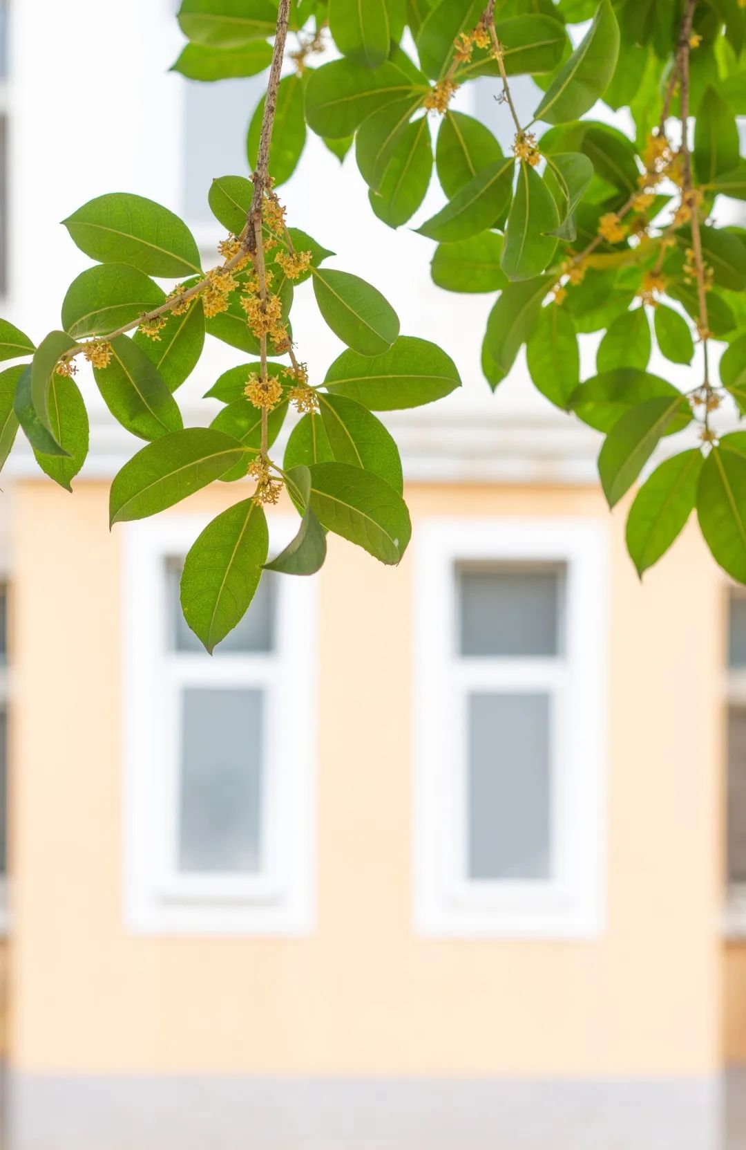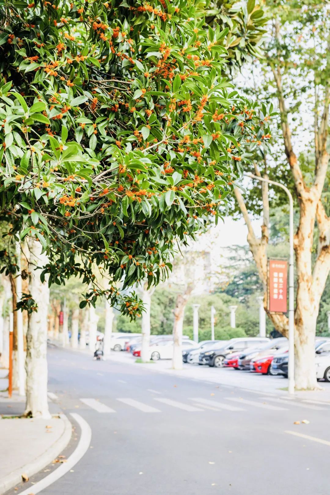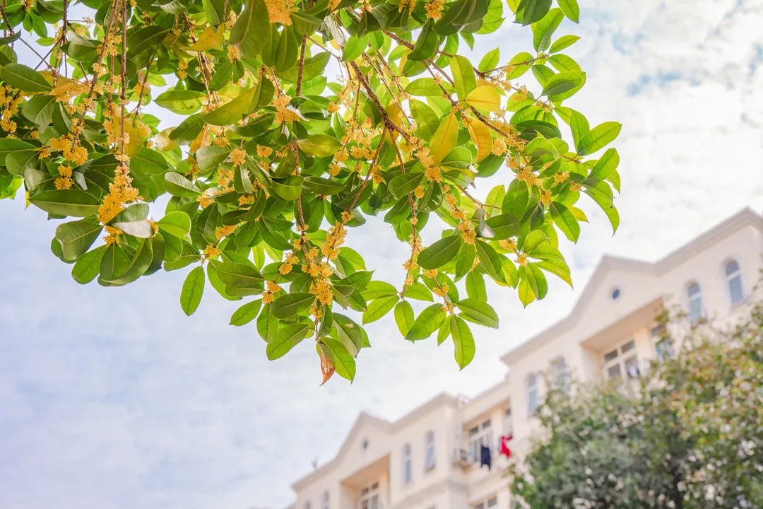 桂花根据花期可以分为秋桂和四季桂,根据颜色可以分为丹桂、金桂、银桂,在bv伟德国际1946校园内,大多为圆叶四季桂这一品种,在丹桂路、北苑等区域,则种有大量金桂和部分丹桂。