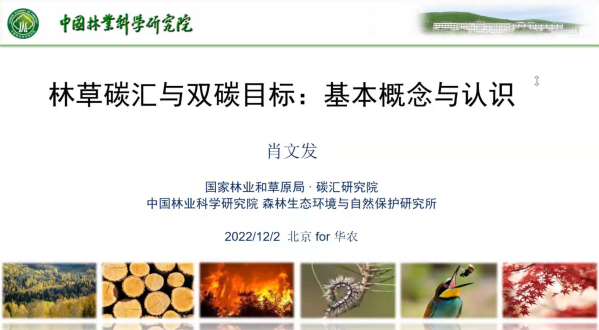 在12月2日晚上进行的讲座中,肖文发研究员作了题为《林草碳汇与双碳目标:基本概念与认识》的精彩报告,报告从人类与碳、林草碳汇有多大、森林有机碳的形成暨碳汇与碳中和、森林碳汇监测与计量、森林碳汇价值及交易与核证等五个方面系统介绍了林草碳汇体系与双碳目标间的关系及实现机制,分析了政策趋势与科学研究趋势,报告内容结合大量数据、政策文件和实践工作,系统、深入、瞄准前沿问题,并将科学、政策、实践相结合;报告结束时,作为华农员工肖文发老师对林学英才班和科研案例课程学员提出了殷切期望,指出学习中要积累经验,能力提高、发挥优点特长,并强调科学研究中要乐于吃苦、勇于战斗、重于事实、善于团结。该场报告也有来自中国林科院京内及京外相关院所、国家林草局调查规划院、湖北省林科院、武汉市园林和林业局等相关单位的人员在线同步参加。