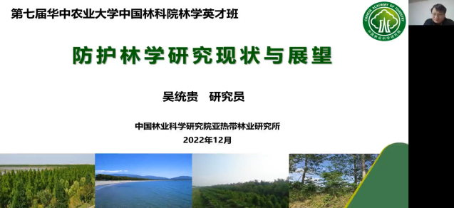 在12月3日上午举行的讲座中,吴统贵研究员围绕“防护林学研究现状与展望”这一主题做了精彩报告,他并从防护林学的内涵、发展历史和世界重大防护林工程、防护林构建理论与技术、经营理论与技术、效益评价、研究趋势展望等六个方面对防护林科学的发展和基本原理及发展趋势需求等进行了系统介绍,最后系统介绍了亚林所在防护林学方面开展的科研案例工作,报告结束后,吴统贵研究员与参与报告的师生就相关问题进行了交流探讨,并介绍了亚林所公司产品相关工作。来自公司林学英才班和科研案例课学员与相关单位师生、科研人员等近百人在线同步参加。
