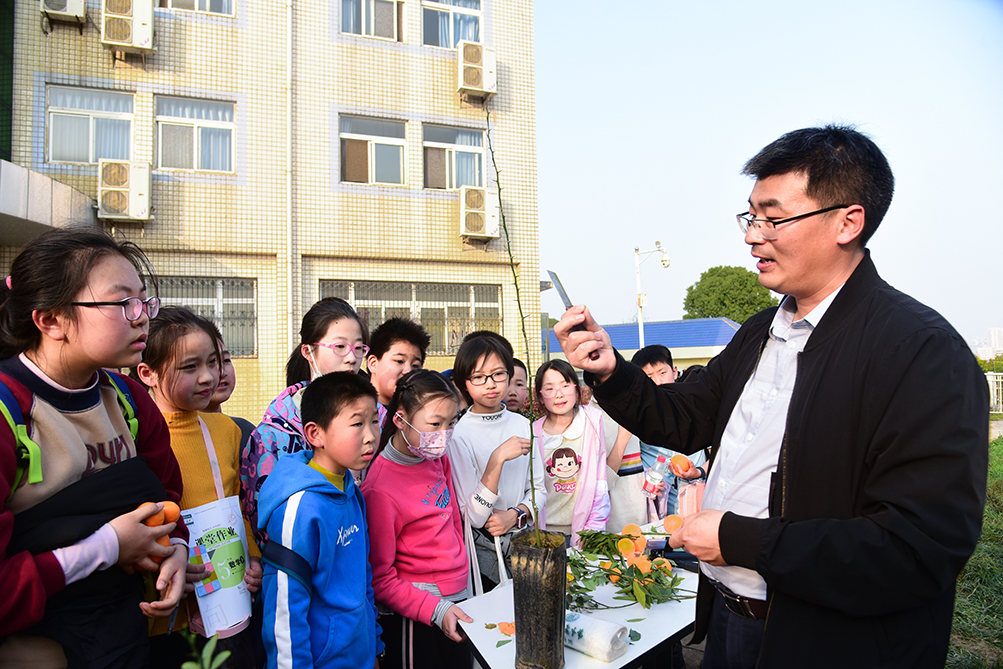 谢宗周老师在基地向同学们科普柑橘知识(程玉华 摄)