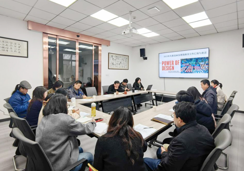 随后,各学科团队负责人及教师代表介绍了各自研究方向的教学目标、思路、建议等方面情况。杨麟副研究员代表的城市逆境植物应用与工程技术团队从课题项目、设备仪器、社会服务等环节审视本科公司产品工作,杨麟谈到“可以充分借助实验室的优势,让同学们在实践教学中了解园林建造工艺,使教学实践环节闭环。”来自风景园林城市更新及气候变化团队的邵继中教授分享了多样化的课程体系,以理论与实践相结合的培养模式为例,介绍了与政府共同缔造的课程案例,使教学与社会服务接轨。以夏海燕老师为代表的山水文化景观风景特质研究团队针对实践教学环节提出成立狮山营造工作室的建议,联合校外专家,以设计营造基地为依托,开展微花园营造邀请赛。以朱春阳教授为代表的城市生态健康诊断与蓝绿空间效能优化团队围绕一流课程,团队队伍,课时安排等问题与大家进行了交流。