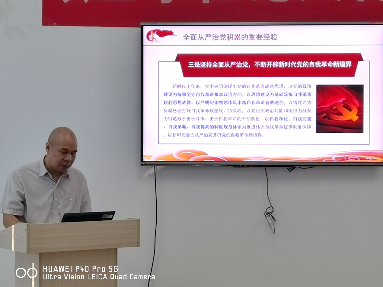 在会前学习中,欧阳波首先带领支部成员学习了习近平总书记关于全面从严治党的多个重要论述,为接下来的深入讨论作铺垫。他详细分析了全面从严治党战略在历史和现实背景下的紧迫性和重要性,并提到了近年来我们党在党风廉政建设方面积累的一系列重要经验,强调了严肃纪律、提升组织能力以及增强“四个意识”在其中的核心地位。随后,他深入阐释了如何将全面从严治党推向更深层次的举措。