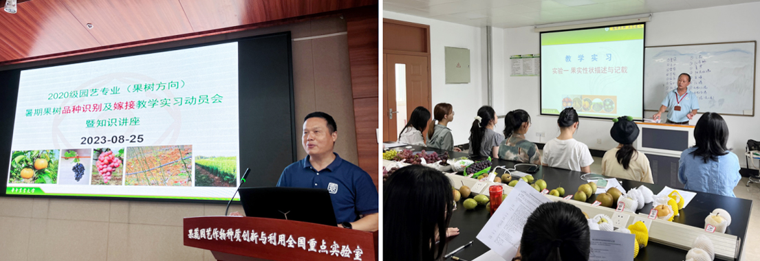 8月25日上午8点半,2020级园艺专业(果树方向)暑期果树品种识别及嫁接教学实习动员大会在园林南楼204报告厅召开,副经理周继荣莅临指导,实习指导教师张青林、解凯东、郭大勇和方燕妮以及41名同学共同参与。周继荣副经理指出虽然本次嫁接实习充满挑战,但华农学子更需练就“吃苦不苦”的本领。张青林老师向同学们详细介绍了本次暑期实习活动安排及果树嫁接理论知识。当天下午在脱毒楼开展了有关梨和葡萄品种性状描述和识别试验。