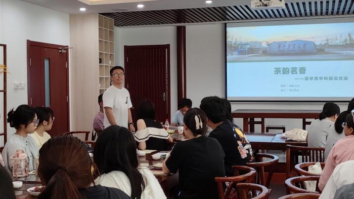 2023年9月9日下午14:30,伟德bv1946官网茶学系2023级研究生新生在园林北楼226耕读茶室开展了“茶韵茗香—茶学系学科前沿交流”主题活动,活动主要由茶学系2023级茶学班班委等人承办,出席人员包括茶学系赵华、闻玮玮、郭飞、余志、张德、王霞等六位老师以及2023级茶学系全体研究生。