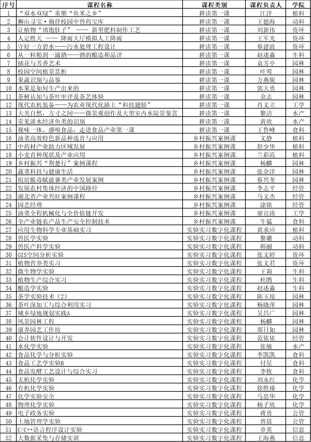 根据《关于开展2023年度耕读教育类课程、虚拟教研室和员工发展指导中心建设的通知》,经团队申报、公司推荐、本科生院组织评审,公司《插花与芳香艺术》、《校园空间植景赏析》、《果蔬识别与品鉴》、《水果是如何生产出来的》、《茶树认知与茶叶审评及茶艺体验》等13个耕读教育类课程建设项目获批立项。详情如下: