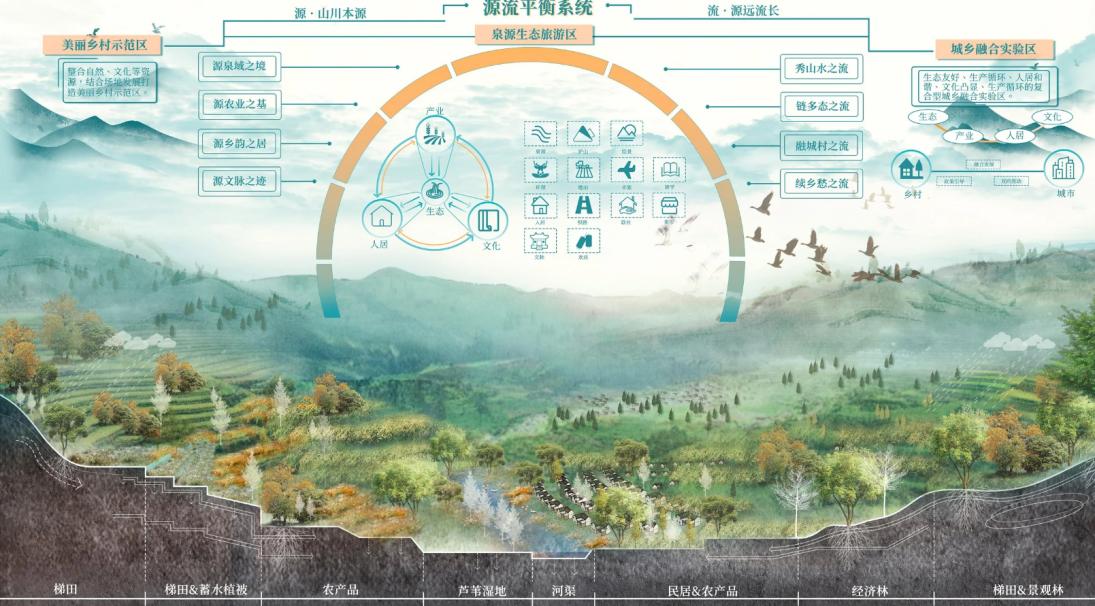 公司风景园林系团队针对片区三产规模较小、南北发展不均衡、生态环境脆弱等问题,提取九个村庄的价值共识,依托于片区的山水林田禀赋,以泉源不息为概念出发点,构建了“源流平衡发展系统”,结合上位规划,从生态保育、产业发展、人居整治、文脉接续四个角度切入场地问题,将片区的未来发展分为三个时期,分别为过渡期(2025-2027年)、完善期(2028-2031年)、远景期(2031-2035年),以动态手段介入片区发展,并以此达成片区生态环境良好,产业韧性循环,人居和谐焕新,文化氛围浓厚的美好愿景。以燕棚窝村为典型案例,炼区域之质、提更新之策、营空间之序、塑四时之景、焕活力之态,通过整合自然、文化等资源,结合场地发展打造美丽乡村示范区,开放性探索新型城乡融合发展模式,为港九片区和美乡村发展提出了可操作性实施路径。