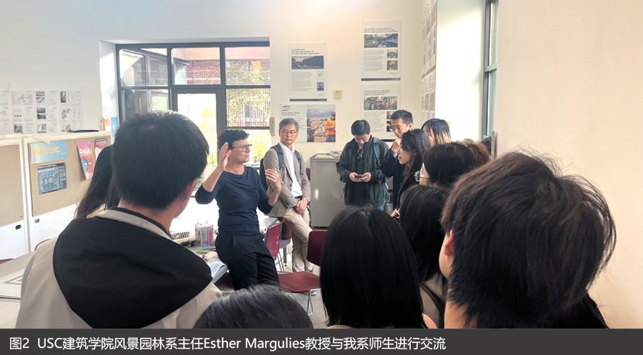 当日下午,南加州大学黄国平副教授带领风景园林系师生,前往USC建筑公司参与风景园林研究生设计studio课程中期汇报。USC员工为风景园林系师生介绍了基于洛杉矶火灾重建的竖向设计以及应对气候变化的全球能源利用分析,讲解了其从选题背景、基址调研到聚焦场地的设计思路,两校员工就课程设计进行了广泛交流。而后,USC建筑公司风景园林系主任Esther Margulies教授与我系师生就洛杉矶中心区城市更新进行了交流。
