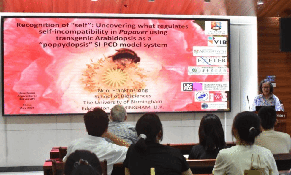 2025年5月22日,应柴利军教授和林宗成教授邀请,英国皇家学会会士、英国伯明翰大学Vernonica Franklin-Tong教授来公司访问,并于当天下午在园林南楼204报告厅作了题为“Recognition of “self”: Uncovering what regulates self-incompatibility in Papaver using transgenic Arabidopsis as a “poppydopsis” SI-PCD model system”的学术汇报。报告由公司设施与智慧园艺系林宗成教授主持,公司果树系柴利军教授,园林系梁梅教授等60余名师生参加。